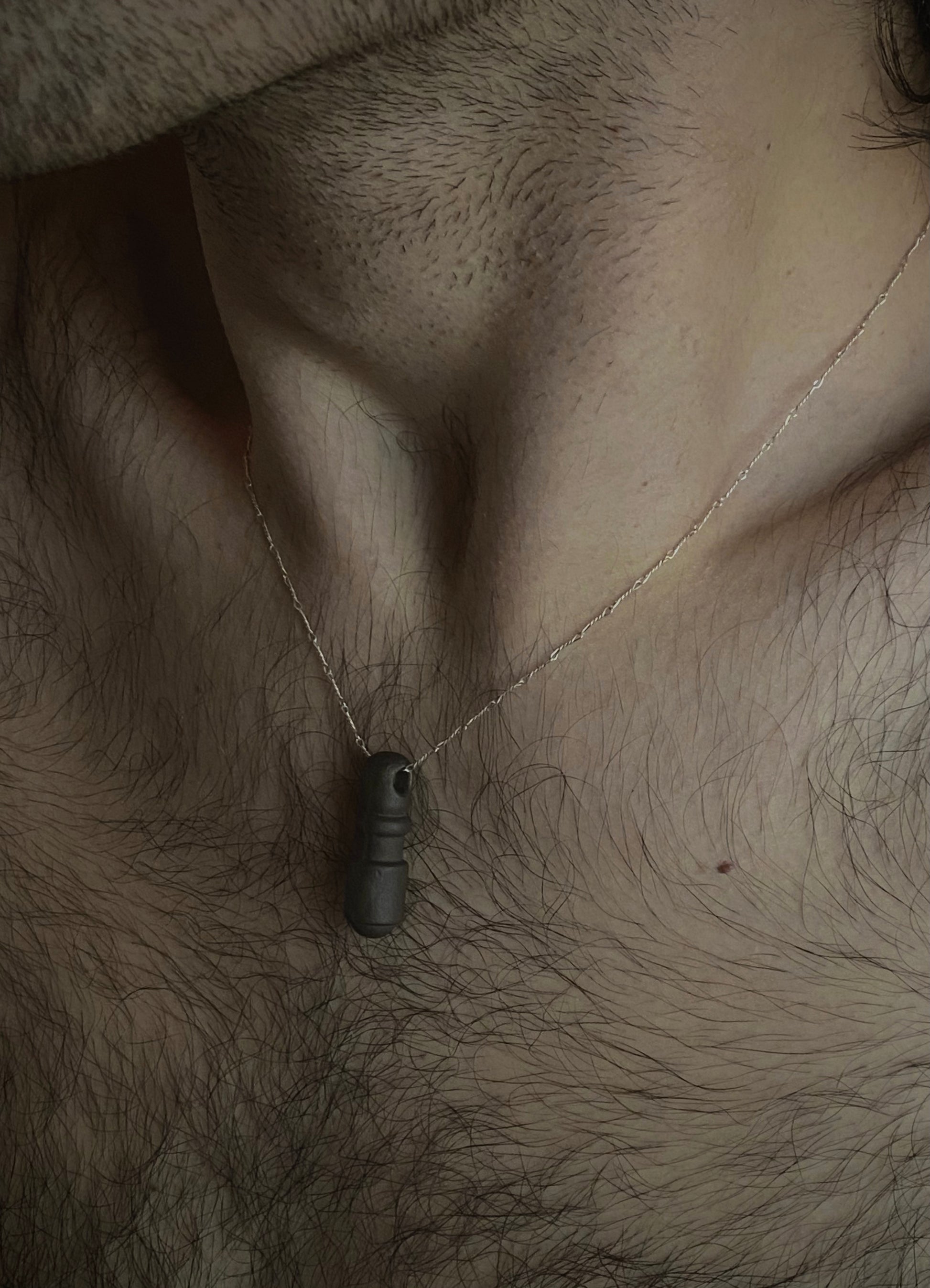 Handcrafted in small batches with unglazed ceramics, fired at 1150°. The pendant hangs on a twisted sterling silver chain.